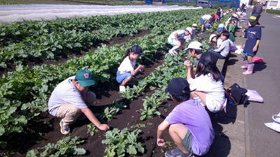 暑い中での作業を体験し、子供たちは農家の皆さんの大変さを実感していました。