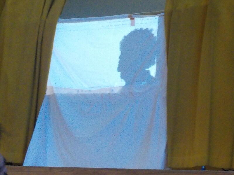 次は、「シルエット当てクイズ」です。白い布の後ろに一人の先生が隠れていて、その先生に代表委員がインタビューをします。みんなが夢中になって、どの先生かを考えました。