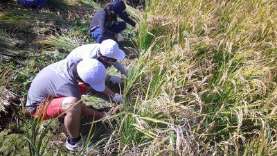 慣れない道具を使い、腰を落としてする作業にはじめのうちは苦労していましたが、徐々にコツをつかみ効率よく稲を刈る姿が見られました。