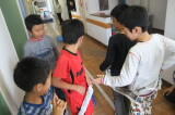 「新聞リレー」では、ペアになった友達と新聞の輪に入り、破かないように障害物を避けてリレーをしました。「ちょっと遅く。」や「段差があるよ。」等と言葉を掛け合って進む姿はとても素晴らしかったと思います。