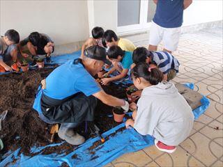今日は5,6年生が校友会の三好さん、太田さん、高谷さん、後藤さん、学校支援コーディネーターの佐藤さんに教えていただきながら菊苗の植え付けをしました。さすがに経験が多い高学年。てきぱきと植え付けを済ませました。