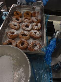 薄力粉やベーキングパウダー、卵などの材料を混ぜ合わせてひとつづつ成形して作ります。合計で約420個のドーナッツを作りました。