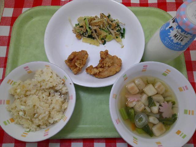 来週卒業式をむかえる6年生をお祝いして、卒業お祝い献立を作りました。縁起のよい鯛を使った鯛めしやさくら型のかまぼこを浮かべたすまし汁、人気メニューの唐揚げ、3年生が作った東光寺たくあんを使った胡麻和えです。