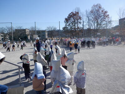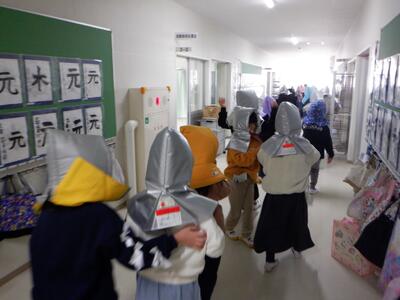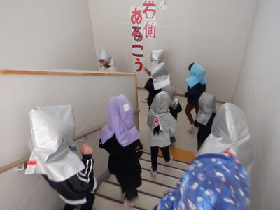 子供たちは、防災頭巾を被るとともに、ハンカチを口と鼻にあてて煙を吸い込まないようにしています。