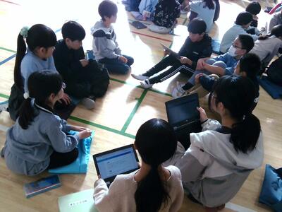 5年生の子供たちが、たてわり班遊びを企画・運営するにあたっての注意点や方法などを6年生から教わりました。6年生は、事前にノートやクロームブックに説明のポイントをまとめていたようで、とても分かりやすい説明が印象的でした。