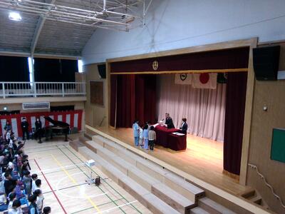 紅白幕や舞台上の看板など、卒業式に向けた会場設営も着々とすすでいます。明日は、5年生の子供たちとともに卒業式練習に臨むことになります。