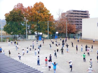 校庭に仮設校舎が建設されていて本来より運動できる面積が減っていますが、全校の子供たちが縄跳びに取り組める時間と場所を割り当てて、順番で取り組めるように計画を立てました。