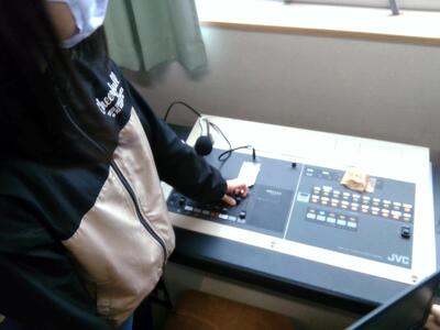 放送室に集まった集会委員会のCグループの子供たちは、クロームブック、放送室のミキサーやマイクなどの機材を自由自在に使いこなして、画像や音声を校内の各教室に配信していました。