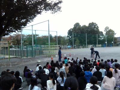 本日(10月24日)は、「運動会児童鑑賞日」です。全校児童が校庭に集まって、みんなの競技や演技を見合いました。