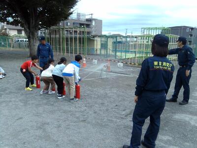 避難訓練後、5年生の子供たちは、日野消防署の皆様から消火器の使用方法についご指導をいただきました。