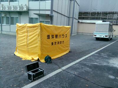 また、5年生の子供たちは、火災時に煙が建物内に充満した状況を再現した施設「煙体験ハウス」に入り、その際の避難方法を体験しました。