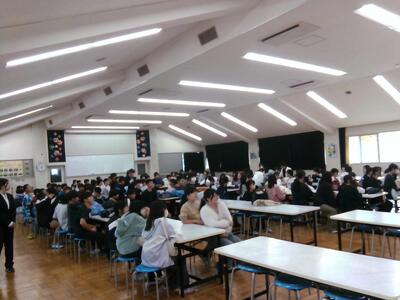 6年生の子供たちは、二中まで歩いて行き、食堂に集合しました。各部活の生徒たちが、体験を行う6年生の子供たちを食堂までお迎えに来てくれ、活動場所まで案内してくれました。二中の校内の状況を把握していない6年生の子供たちが、迷子にならないようにという計らいです。何という「おもてなし」!