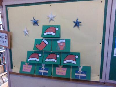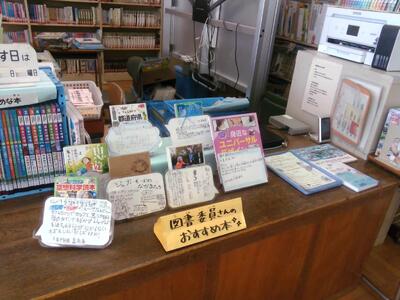 また、図書室のカウンターには、図書委員会の子供たちによる「おすすめ本」の紹介文とともに、本が展示されています。