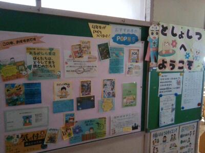 図書室の入口には、4年生の子供たちが自主的に作成した「おすすめ本」のPOPが掲示してあります。国語に時間に取り組んだ活動を一部の子供たちが授業時間以外にも自発的に取り組み、「ぜひ図書室に掲示してほしい」と教職員に提案したようです。意欲的で大変すばらしいことです。