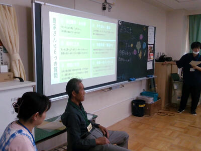 そして、各農園で栽培してらっしゃる作物をご紹介いただき、栽培するうえでの工夫や苦労などをお話いただきました。実際に栽培している野菜がアップで映し出されると、子供たちから「おいしそう!」「きゅうり、好き!」などの素直な反応がありました。