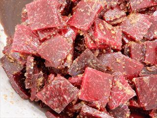 ↓↓↓これがくじら肉です。下味をつけているところです。見た目、まぐろみたいですね。