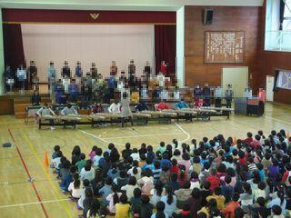 ピョンチャンオリンピックでは、日本の選手たちが連日大活躍。世界の選手に交じって堂々と勝負に挑む選手たちの気迫は、たくさんの人に勇気をくれています。この機会に、子供たちにも世界の国々に興味をもち、身近に感じてほしいと願っています。全校朝会では、イランのテヘラン日本人学校に勤務経験をもつ教員が、赴任当時の様子やその国の特徴を楽しいクイズで紹介しました。1階の廊下にイランの伝統楽器を展示すると、子供たちは興味深げに見入っていました。