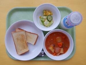 はちみつレモントースト・トマトシチュー・キャベツとコーンのサラダ・牛乳