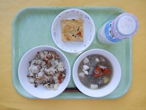 糧飯・卵の唐草焼き・根菜の胡麻汁・牛乳