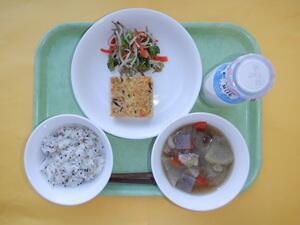 胡麻ご飯・五目卵焼き・じゃこ入りお浸し・お事汁・牛乳