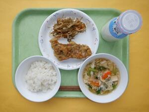 ご飯・白身魚の礒辺揚げ・昆布ともやしの和え物・かきたま汁・牛乳
