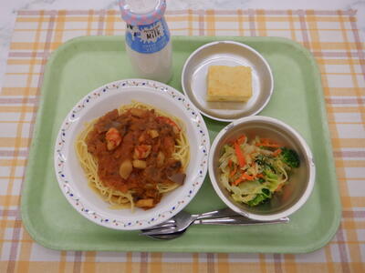スパゲティー(オーマイ)/豚骨(群馬県)/えび(インドネシア)/ほたて、玉ねぎ(北海道)/にんにく(青森県)/トマト、キャベツ、ブロッコリー(愛知県)/パセリ、にんじん、さつまいも(千葉県)/水菜(茨城県)/マッシュルーム、トマト缶、卵(国産)