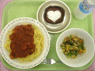 【献立】スパゲッティペスカトーレ アーモンド和え 豆腐入りココアケーキ 牛乳