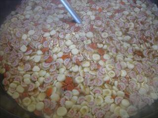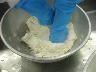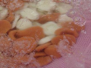 お祝い事に用いられる紅白の色は「紅白なます」と「紅白白玉団子汁」に取り入れています。白玉の赤はトマトピューレで色付けをしています。白玉粉から練って1つ1つ調理員さんが丸めています。