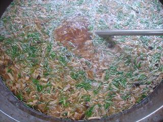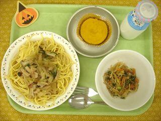 きのこスープスパゲティは3種類のきのこ(ぶなしめじ、えのきたけ、エリンギ)が入っていて秋を感じる献立です。