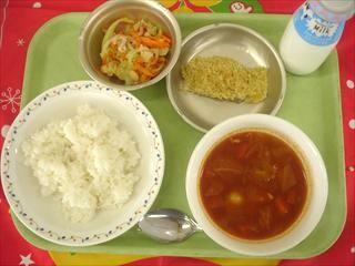 【献立】ごはん たらの香草パン粉焼き お豆のハニーサラダ ミネストローネ 牛乳