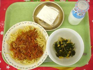 【献立】豚肉ときのこのスパゲティ わかめサラダ シュトーレン風ケーキ 牛乳
