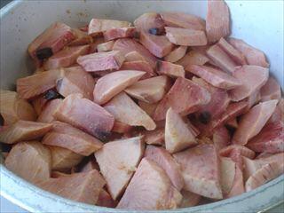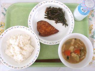 【献立】ご飯 もうかさめのから揚げ 茎ワカメとコンニャクのピリカラ炒め ひっつみ汁 牛乳