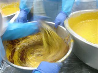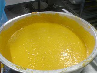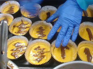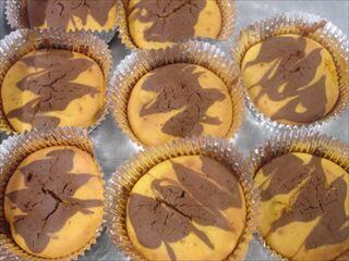 今日は「トラケーキ」を作りました。かぼちゃを蒸して潰し、生地に混ぜ込んでいます。かぼちゃの黄色とココアの茶色でマーブル模様を描きました。