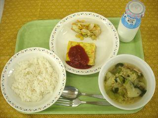 【献立】ごはん ポテトオムレツきのこソース フレンチサラダ ABCスープ 牛乳
