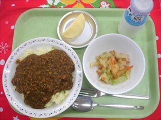 【献立】小松菜のドライカレー ポテトガーリック風味サラダ りんご 牛乳