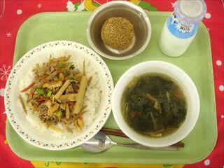 米・・・千葉県、にんにく、ごぼう・・・青森県、もやし・・・栃木県、さつまいも・・・千葉県、人参、小松菜・・・日野市(旗野利之様より)、東光寺たくあん・・・日野市(福島幹男様より)、豚ひき肉・・・群馬県、油揚げ・・・滋賀県、わかめ、茎わかめ・・・北海道