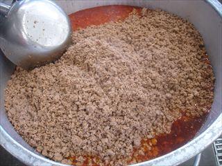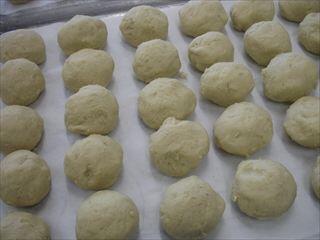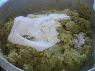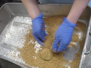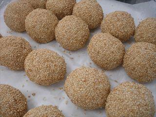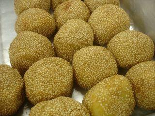 さつまいもの胡麻団子はさつまいもを蒸して潰し、砂糖と白玉粉を混ぜて作ります。1つ1つ調理員さんが形を作って、ごまをまとわせて揚げています。