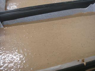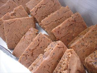 今日は「黒ゴマ蒸しパン」を作りました。黒ゴマ蒸しパンは東北地方で農作業の合間に食べられていた「がんづき」というものに似せて作っています。薄力粉、ベーキングパウダーを振るって、黒砂糖、水、醤油、油、白ゴマ、黒ゴマと一緒に混ぜ合わせて焼いています。