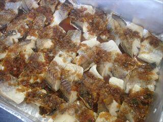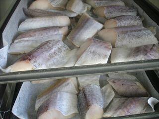焼くと大分小さくなってしまいます。焼いたすけとうだらに香味だれをかけていただきます。ご飯がすすみます。