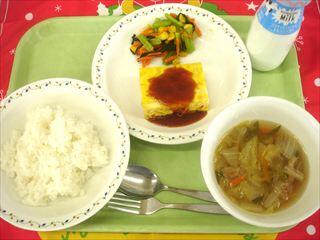 【献立】ごはん パンプキンオムレツ こまつなとコーンのソテー 白菜と長ねぎのスープ 牛乳