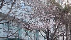 正門スロープの桜は咲き始め、ピンク色に染まり始めました。