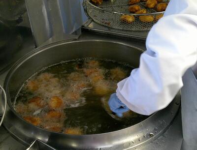 給食室では、焼かずに油で揚げています。最後にかける甘じょっぱいタレも手作りしています。