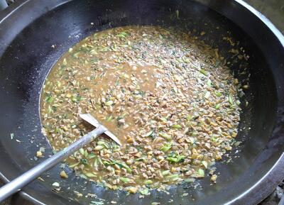 米粉と白玉粉を練り合わせ、一つ一つ調理員が手作業で丸めていきました。甘じょっぱいタレをかけて提供しました。