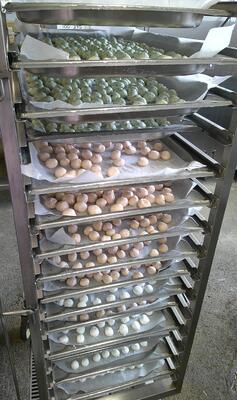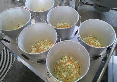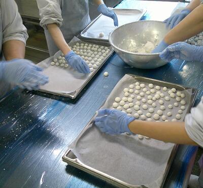 給食室では、大量調理のため、試行錯誤しながら何度も試作を重ねました。