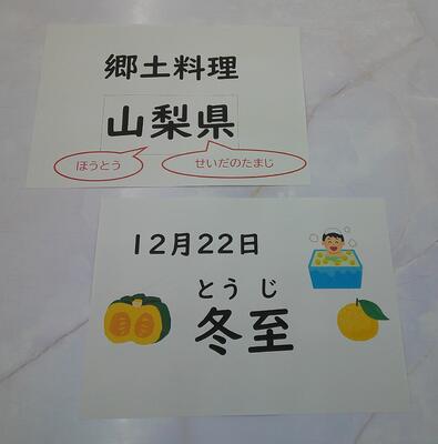 主食の「ほうとう」は、平たい麺が特徴的な山梨県を代表する郷土料理です。季節の野菜を入れて味噌で煮込みます。給食では、今日は「冬至」ということで、「かぼちゃ」を入れました。