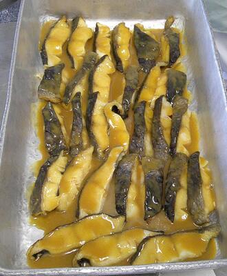 魚は「真鱈」を使いました。白身の魚でクセがなく、脂質が少なく、淡白な味が特徴です。今日は、オリーブ油、バジル、パセリ、にんにく、レモン汁、白ワインを混ぜたソースをかけ、オーブンで焼きました。身が厚くて、おいしい魚料理となりました。