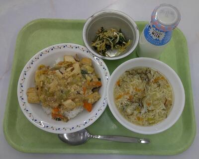 豚ももひき肉に、豆腐、ねぎ、卵、パン粉などを練り合わせ、一つ一つの団子を調理員さんが手作業でスープの中に落とし入れて作りました。手作りの肉団子は、肉のうまみが感じられ、おいしいです。