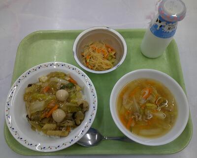 中華丼は、日本で考えられた食べ方で、ごはんの上に八宝菜をのせて食べます。八宝菜の「八」は、「いろいろな」という意味があります。