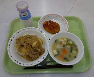 主食は「豚丼」。一人の生徒が調べていました。豚のももとバラの2種類を使用して、豚肉のうま味をいかして作りました。