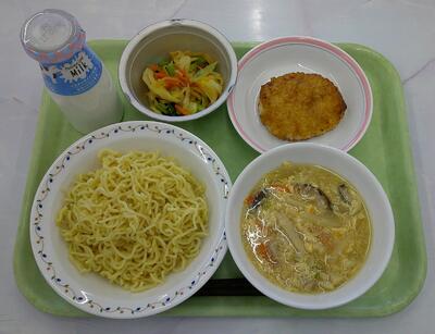 2年生が調べてくれた料理は北海道芦別の「ガタタンラーメン」です。具だくさんでとろみのあるスープが特徴の塩味のラーメンです。給食ではつけ麺風にして提供します。